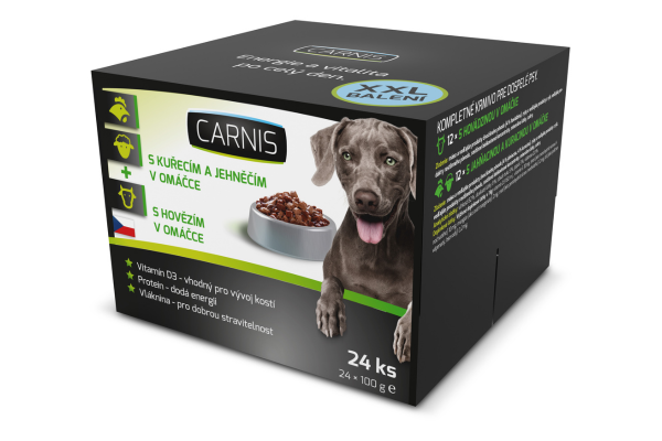 CARNIS paštetuose yra sultingų vištienos, avienos arba jautienos gabalėlių, aplietų gardžiu padažu. Juos patogu patiekti, o 100 g pakuotė skirta vienam šėrimui. XXL pakuotėje yra 12 paštetų su jautiena ir 12 paštetų su vištiena bei aviena.